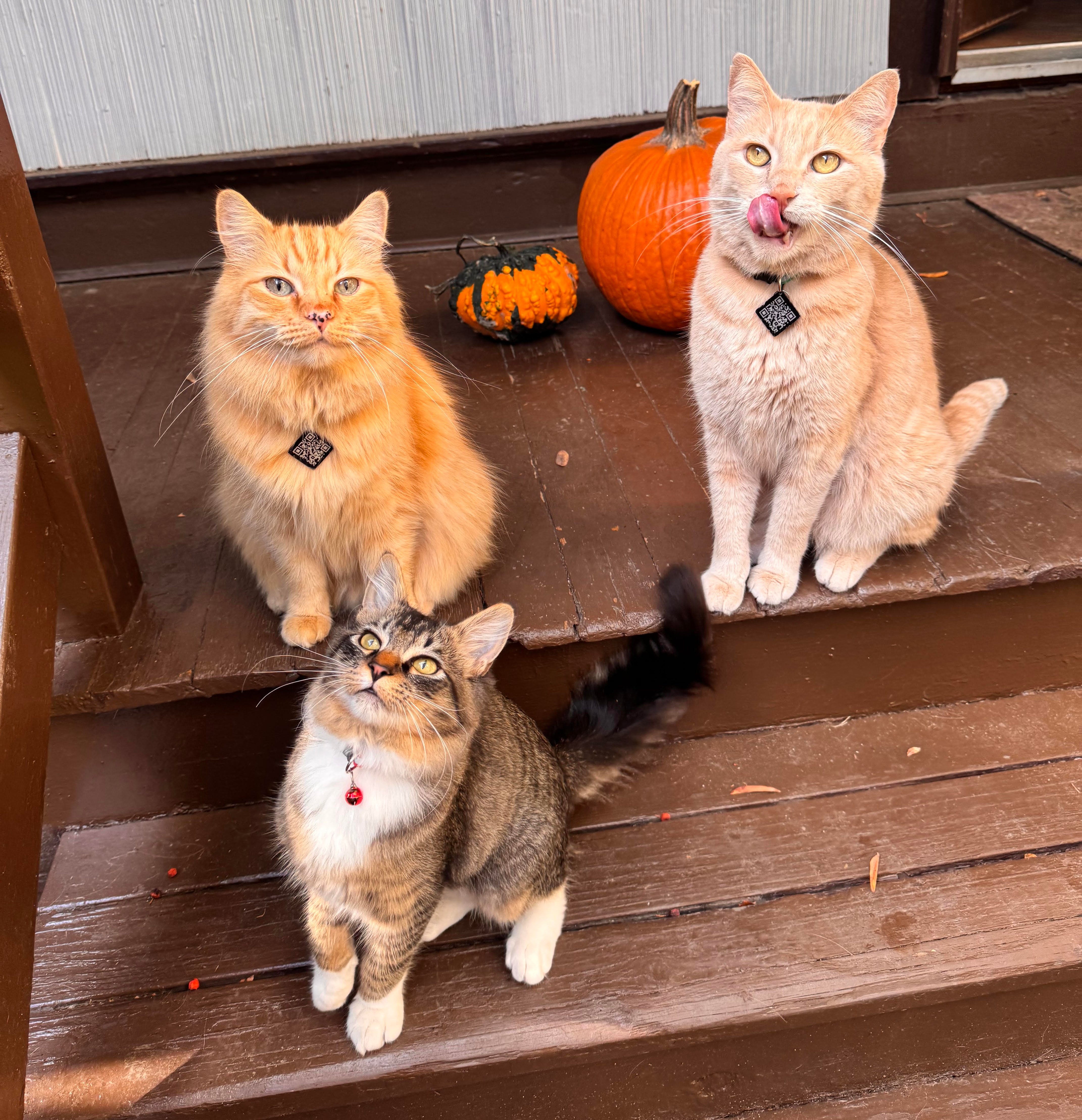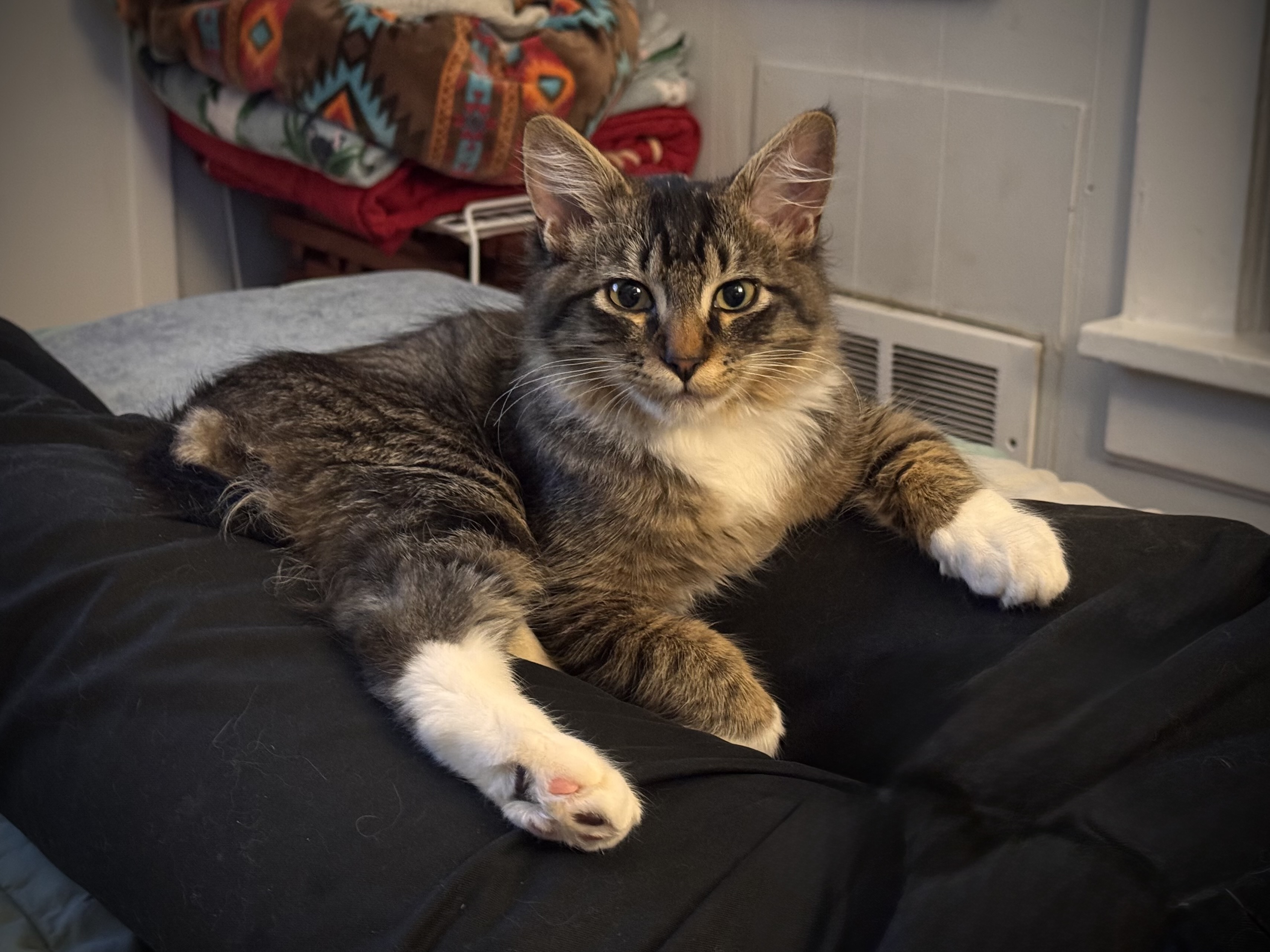 I’m the most handsome, king of the yard, and I’m confident about it. I’m plush, unassuming, peace-loving, and very physically talented. I’m shy but actually very interested in you. My favorite things are lounging in the grass, catching birds or rats to the chagrin of my people, fishing discarded lint roller tape from the garbage, and getting my butt rapidly lightly smacked and scratched. I was hit by a car crossing 12th the night of Sept 30th/Oct 1st 2025 and got a tail pull injury that paralyzed my tail, bladder, and anus. Thankfully my ability to pee and poop on my own later returned, but my tail is still not completely the same, so be gentle with my lower back for a while. When traveling I need to hunker in the back and not be disturbed. I don’t like being held in one place for more than a few seconds, even by people I trust, but do like getting petted and brushed, some times like being carried elsewhere, and might perch on your chest if you’re lying down. I jump away from Pumpkin and Miso when they’re’ being annoying, although I know I could beat them up easily and like playing with the kitten sometimes. I run and hide from other animals until I get to know them. I’m egalitarian and forgiving. I’m reserved unless I’m on my own turf and feeling really relaxed. I’m quiet, but I do chatter and chirp when excited.
